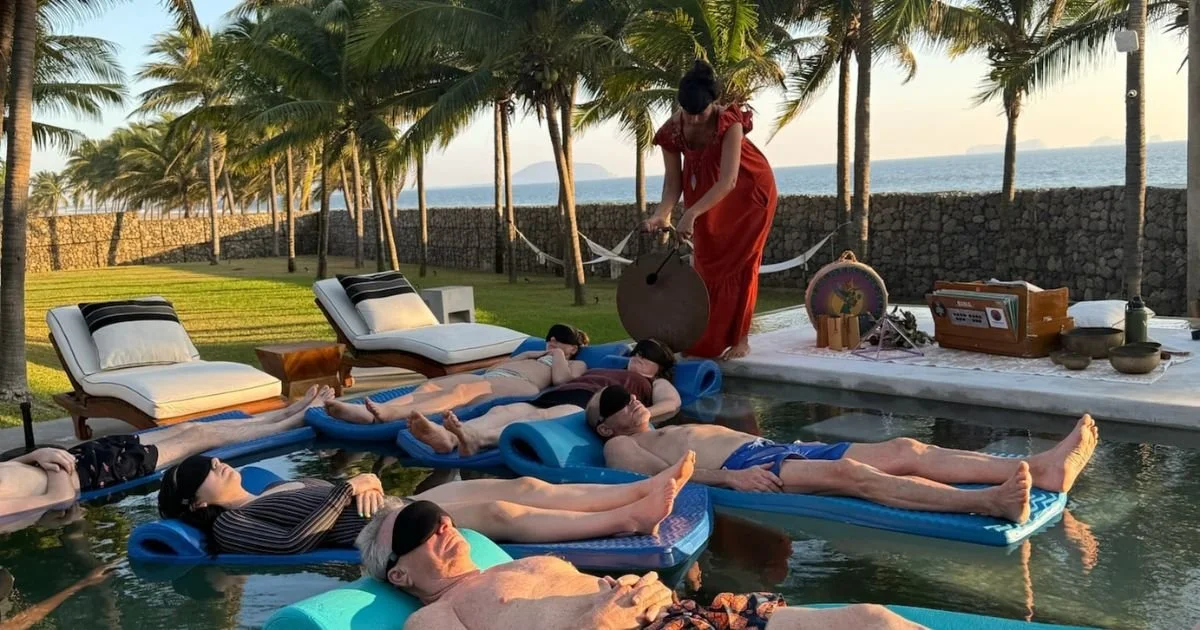 Guests float in warm, buoyant water while guides set intentions. The ocean’s natural rhythms prime the body for sound.